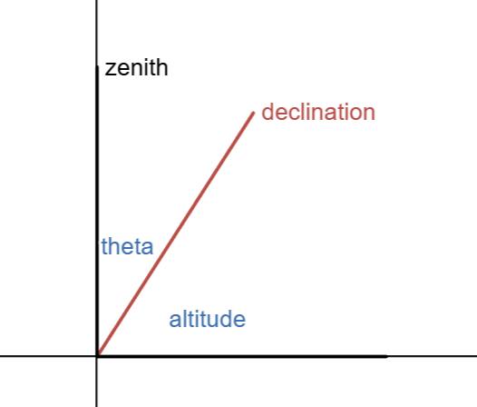 From this geometry, we can construct the following relationship between the zenith \(z\), declination \(\delta\), and altitude \(A\)
