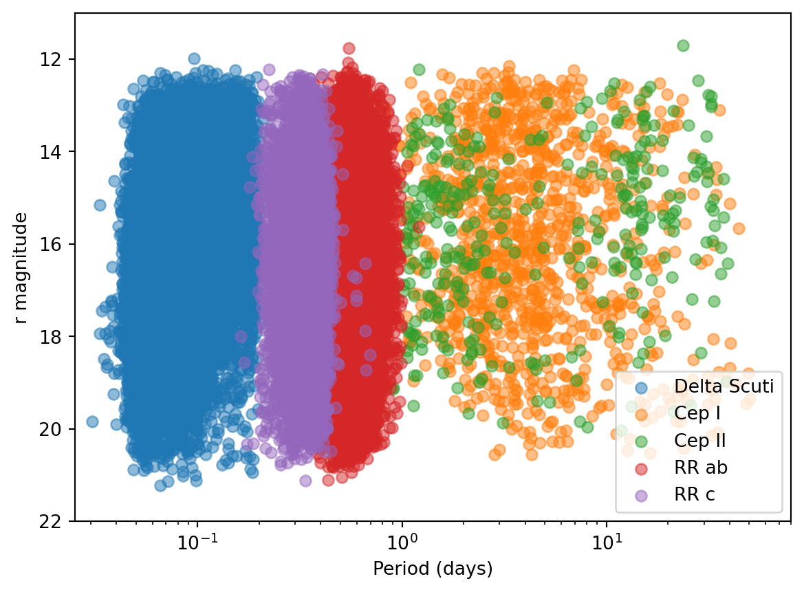 D = data.group_by("Type").groups[3]# plot r-band mag vs period for all stars
