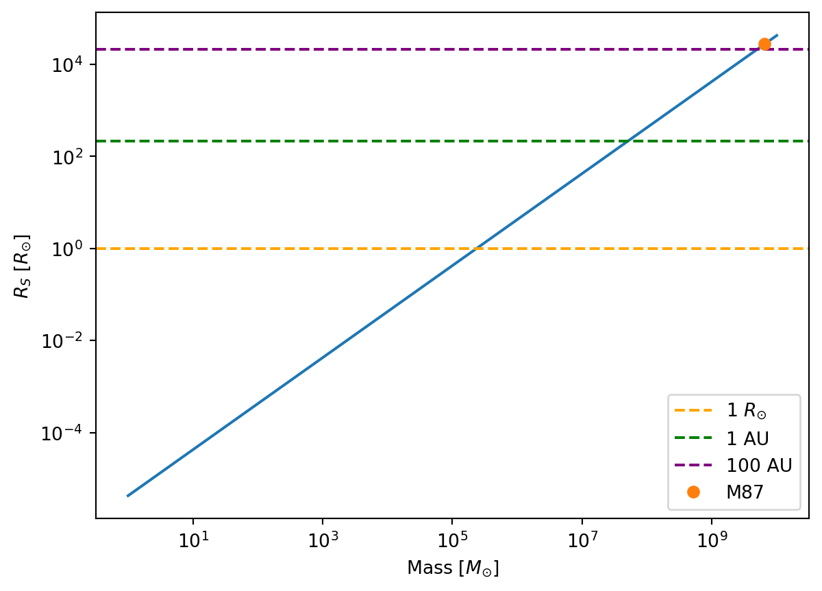 The code chunk below also creates the desired log-log plot in part b) of the Schwarzchild radius as a function of black hole mass.